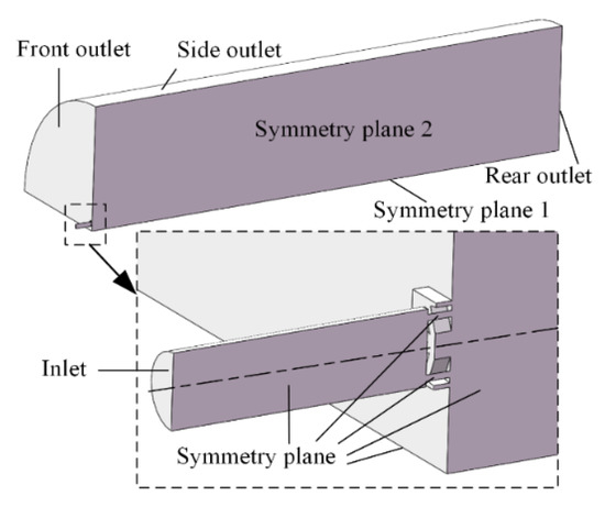 The boundary conditions are shown in Figure 5. The jet medium is constant air; the jet inlet is set as the pressure inlet with a gauge pressure of 0.1–0.5 MPa; the front and rear jet outlets are set as pressure outlets with a gauge pressure of 0 MPa; the symmetrical plane is set as the symmetry; and the remaining boundaries are set as the wall. The specific boundary conditions are shown in the Table 2.