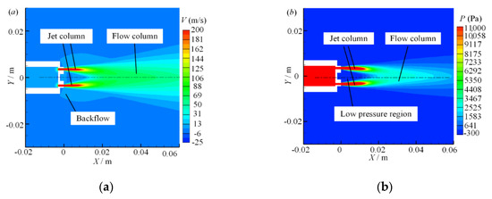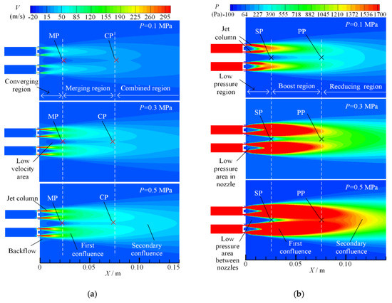 When the nozzle spacing ratio (d/w = 3) is fixed and the inlet pressure P is 0.1 MPa, 0.3 MPa and 0.5 MPa, respectively, the velocity and pressure contours of symmetry plane 2 are as shown in Figure 8.