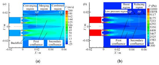 It can be seen from Figure 8b that with the increase in inlet pressure, the axial and radial ranges of the jet column expand, which leads to the expansion of the pressure impact region of the first and second confluences, and the overall flow region is widened. The low-pressure areas between the nozzles and in the nozzles are narrowed, but the starting point (SP) and the peak point (PP), which are located at X = 22 mm and X = 75 mm, respectively, on the parallel jet axis are not changed at the same point as the velocity-merging point (MP) and velocity-combined point (CP). Moreover, the diversion of the low pressure region, the boosting region and the reducing region does not change as well with the increase in the inlet pressure. The velocity region corresponds to the pressure region.