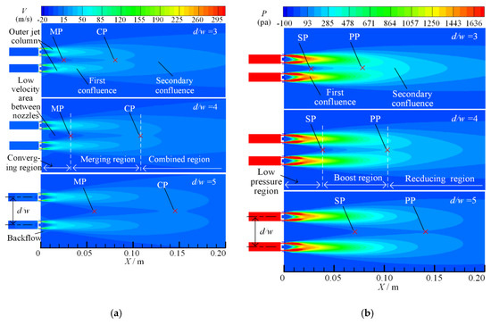 When the inlet pressure (P = 0.1 MPa) is fixed and the nozzle spacing d/w ratio is 3, 4 and 5, respectively, the velocity and pressure contours on symmetrical plane 2 of the dual parallel jet are as shown in Figure 9.