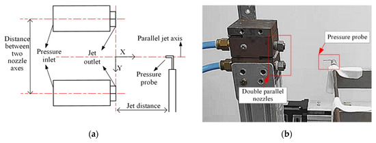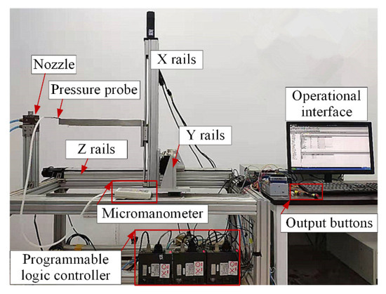 In this experiment, the pressure value on the parallel jet axis was collected and compared with the simulation results. As shown in Figure 10, the experimental test system is mainly composed of an operational interface, output buttons, a programmable logic controller, three-degree-of-freedom nozzle-moving rails, porous nozzles, a pressure probe and an air compressor.