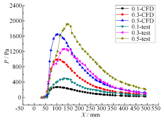 It can be seen from Figure 13 that under certain inlet pressure, the nozzle spacing ratio is different, and the pressure change trends of the experiment and simulation on the parallel jet axis are the same—both of them rise rapidly from zero pressure to their peak value, decline slowly, and finally merge and decay. With the increase in the nozzle spacing ratio, (1) the starting point (SP) and the peak point (PP) move backward; (2) the change rate of pressure becomes smaller and both rise and fall speeds decrease; and (3) the peak value of pressure decreases.