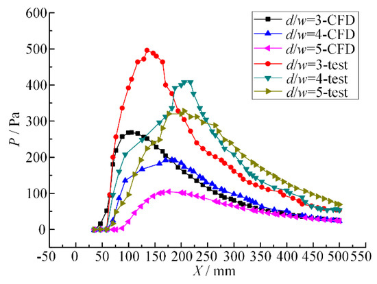 When the inlet pressure is 0.1 MPa and the nozzle spacing d/w ratio is 3, 4 and 5, respectively, the pressure change curves of the dual parallel jet axis are as shown in Figure 13.