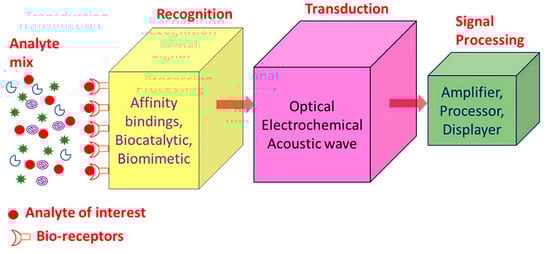 - Recognition: A recognition element also known as a bio-receptor, which is a biological element (DNA probe, enzyme, antibody, etc.) susceptible to analyte recognition (antigen, complementary DNA, enzyme substrate, etc). It is important for the bio-receptor to be directly sensitive to the target analyte in order to avoid interference from certain signal sources or substances from the sample matrix.