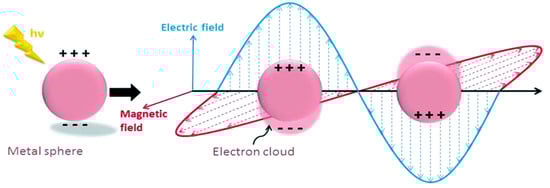 LSPR is another mechanism for the absorption of light, which is observed within the visible light range for several metals’ NPs such as Ag, Au and Cu. It is also an optical phenomenon when a light incident on a metal NP is smaller than the wavelength of the incident light [6]. This results in a strong interaction between the electrical field incident and the free conductive electrons of the metal NPs shown below in Figure 2 [12].