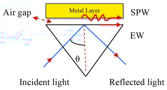 The SPW is generated on the surface of the air–metal interface. The associated evanescent wave (EW) decreases exponentially from the air to metal. It is therefore difficult to sustain the air gap between the prism and metal layer. E. Kretschmann et al. [29] improved the Otto configuration as depicted in Figure 4.