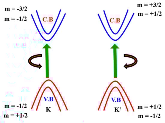 The monolayer TMDCs’ electronic structure near Fermi energy defines two important properties of materials—electrical and optical properties—which can be defined by two copies of degenerate valence bands and conduction band around the K and K’ points (Figure 5). This is similar to that of a gaped graphene with a broken inversion symmetry and can be modelled with the degree of freedom of spin and valley pseudospin (K or K’) by an efficient 2D massive Dirac Hamiltonian. The spin-up condition in the K Valley is degenerated by the spin-down condition in the K’ valley. (Figure 5). As several groups have shown experimentally that degeneration can be removed by applying an out-of-plane magnetic field to break the time-reversal symmetry [61,62,63,64], TMDCs in the K and K’ valleys yield nearly finite Berry curvature and orbital magnetic moments (m), i.e., the broken TMDC inversion symmetry. Specifically, the magnetic moment allows for the combination of a pseudospin valley with the magnetic field as stated above and gives rise to a valley-dependent optical theoretical framework [65,66,67,68]. Here, the azimuthal total quantum orbital is represented by m and it is also known as an angular spin momentum. Hence, the electrical transport properties are also valley-based.