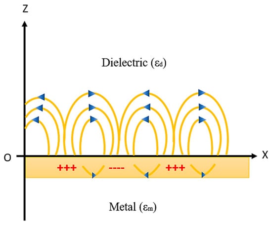 SPWs are longitudinal waves (i.e., p-polarized) generated on the metal–dielectric interface when light passes through the metal. Both the metal and dielectric sample consist of complex RI nm = and nd = , respectively, as shown in Figure 6. The surface plasmon propagates in parallel to the x direction as an electromagnetic wave with a magnetic field directed in parallel to the y direction, that is, the transvers magnetic polarization (TM) state.