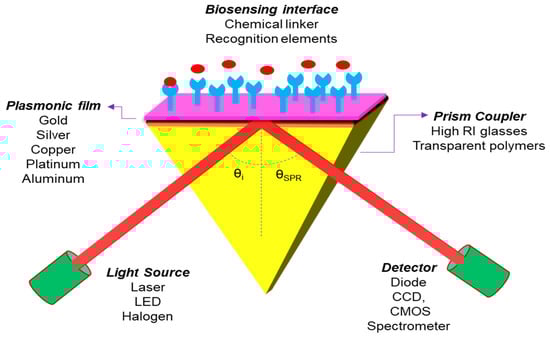 SPR sensors, i.e., gold, copper or silver planar films have been utilized for around 30 years as refractive index-based sensors to detect the binding of analytes on or near a metal surface. This has been commonly used to detect a wide range of analyte–surface binding interactions including small molecular adsorption, ligand–receptor binding, self-assembled monolayer protein adsorption, antibody–antigen binding, the hybridization of RNA and DNA, and DNA–protein interactions. Just as in LSPR spectroscopy, SPR spectroscopy’s sensing mechanism depends on the minor changes in the refractive index occurring in response to analyte binding at or near the surface of a noble metal (Au, Ag, Cu). Chemosensors and biosensors based on SPR spectroscopy have many desirable properties as shown in Table 1 [20,21,22]. A biosensor is a device which enables the detection and analysis of biomolecules. Biosensors are used in many applications like drug production, disease prevention and pollutants’ detection, etc. Figure 1 displays a component of biosensor; it consists of the following: