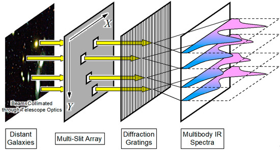 Figure 1. Schematic illustration of multi-object spectroscopy (MOS) for deep galactic astronomy. The starlights from distant galaxies are spatially filtered by the multi-slit array plate, and guided to the gratings to project multiple spectra on the infrared imaging device for simultaneous spectroscopy.