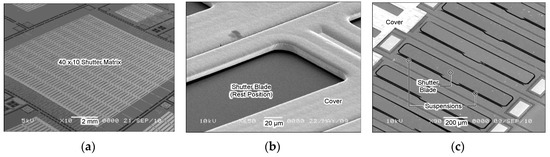 The device shown in Figure 2a is a trial sub-cluster array that contains 40 × 10 shutter elements in a 20 × 20 mm area. Figure 2b is a close-up SEM view of the shutter blade; only a part of which is showing through an opening of 80 × 950 µm in area made in the cover plate. The full structures of the shutter blade are visible after removal of the cover plate, as shown in Figure 2c. The blade is 100 µm in length measured from the rotation center to the tip, and 1000 µm in width in the direction parallel to the torsion bars; each torsion bar is 450 µm long and 1.5 µm wide. The blade and the torsion bars are made of a silicon-on-insulator (SOI) layer of a uniform thickness of 1.4 µm. The cover plate is made of 12 µm thick electroplated nickel, which shows faint relief patterns of the underlying shutter structures.