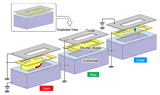 The shutter blade is suspended over a through hole etched in the substrate, as illustrated in Figure 3. When no voltage is applied, the shutter blade remains flat at the rest position. Due to the metallic coating on the shutter, the incoming infrared light is rejected by the blade at this position but a fraction of light may scatter and leak through the tiny gaps around the blade. Therefore, the gap is firmly closed by electrostatically attracting the shutter blade to the cover using the voltage applied between the shutter and the cover. To let the incoming light through the slit, on the other hand, the shutter blade is retracted almost 90° inwards into the through hole by the electrostatic torque induced by another voltage applied to the bottom substrate; the surface of the through hole is coated with an electrical insulating silicon oxide, which prevents electrical short circuit upon contact with the shutter blade. A transparent substrate such as glass could be used as reported by Viereck et al. [24]. However, a silicon wafer with through holes was chosen in this work to minimize the transmissive loss through the aperture.