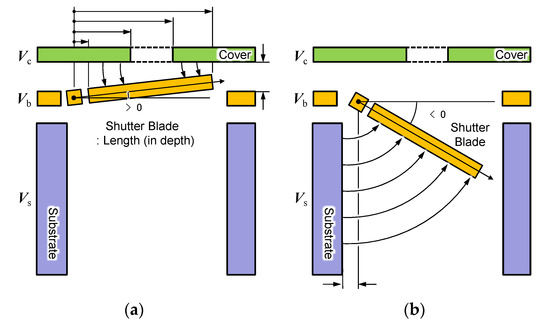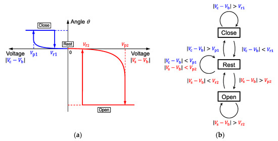 The hysteresis loops shown in Figure 5c and Figure 6c are merged in a simplified diagram as shown in Figure 7a; the dynamic behavior of damped oscillation is omitted. The vertical axis is the blade’s angle, while the lateral axes are the drive voltages; the left-pointing axis is the potential difference between the cover plate ( V c ) and the shutter blade ( V b ), and that on the right-hand side is the voltage between the substrate ( V s ) and the shutter blade ( V b ). By using the combinations of the differential voltages, the shutter blade position can be set at either the rest, close, or open position. Note that the angle is governed not solely by the electrical potentials of the individual electrodes but the differential voltages | V c V b | and | V s V b | will determine the shutter status. Characteristic voltages V p 1 and V r 1 are the pull-in and the release voltages for the shutter’s closing motion, respectively, and V p 2 and V r 2 are those for the shutter’s opening.