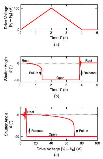 A monopolar triangular wave of 10 V max shown in Figure 5a was used as a differential voltage, which was a potential difference between the voltage applied to the cover plate, V c , and that to the shutter blade, V b , and the transient behavior of the blade angle θ was observed. The slew rate of the ramped voltage was set to be intentionally slow (~2 s) compared with the time constant (~37 ms) corresponding to the mechanical resonance (~27 Hz) of the shutter blade so that the calculated transient behavior could be regarded as quasi-static characteristics.