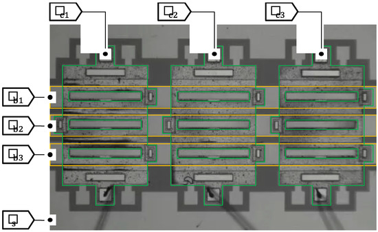 Figure 8. Electrical interconnection of the 3 × 3 micro shutter array. The shutter blades are connected in the lateral direction to form three rows, while the cover plates form three columns. The substrate is used as a common electrode.
