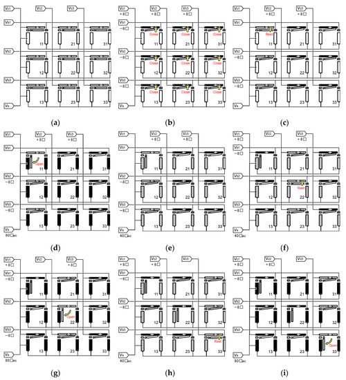When all the electrodes are electrically grounded, the shutter elements remain at the rest position as schematically shown in Figure 9a. When voltages of the opposite polarities are applied to all the cover plates (+8 V) and the shutters (−8 V), the differential voltages exceed the pull-in voltage, V p 1 , and all the shutter elements are closed as shown in Figure 9b. To open the shutter element located at position 11, for instance, the voltage applied to the cover in the first column ( V c 1 ) and that to the shutter blade in the first row ( V b 1 ) are removed to free the shutter blade to the rest position, as shown in Figure 9c; the other shutter blades in the same column or row are still held at the close position because of the remaining differential voltages which are greater than the release voltage V r 1 . Once the shutter is selectively released, it can be attracted to the open position by the voltage applied to the substrate, 80 Vac, which is greater than V p 2 , as shown in Figure 9d, without affecting other shutters at the closed position. Opening the shutter requires a rather high voltage but momentarily for 100 ms only, after which the voltage can be reduced to 40 Vac, as shown in Figure 9e to lower the risk of electrical breakdown; with this voltage being greater than V r 2 , the shutter blade is held at the open position. To open the next shutter at position 22, the same sequence is repeated to selectively release the shutter to the rest position as shown in Figure 9f and then open it by applying a high voltage to the substrate as shown in Figure 9g. Subsequently, the shutters at position 33 are opened through steps shown in Figure 9h,i. The sequence can be repeated unlimitedly to open any one of the remaining shutters. In addition, this scheme is scalable to M × N arrays by using M + N + 1 addressing electrodes, including the substrate, rather than M × N + 1 individual electrodes.