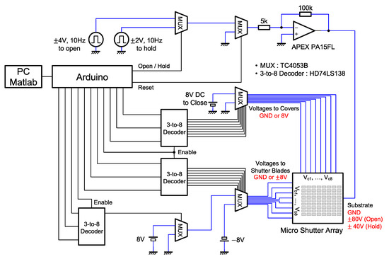 A MATLAB®-based control system was developed to demonstrate all passive addressing of the shutter matrix. Figure 10 shows the block diagram of the controller. The digital outputs of Arduino microprocessor (Arduino Uno SMD R3, Arduino, LLC, Boston, MA, US) were used to control three pieces of 3-to-8 decoders (HD74LS138, Renesas Electronics Corp., Tokyo, Japan); each decoder transmits eight bits of commanding signals to the subsequent multiplexers (MUX, TC4053B, Toshiba Corp., Tokyo, Japan), which had eight switches in parallel to choose one of two input lines each. The combination of these decoders and multiplexers gives voltages to the shutter covers ( V c 1 ,   V c 2 ,   ,   V c 8 ) and the shutter blades ( V b 1 ,   V b 2 ,   ,   V b 8 ). The output voltage could be chosen from 0 V, +8 V, and −8 V. On the other hand, the drive voltage to the substrate was generated from the external function generators (±2 V and ±4 V at 10 Hz), one of which was chosen by the multiplexer and amplified in the analog voltage booster (PA15FL, APEX Microtechnology, Tucson, AZ, US) to produce square waves of either ±40 V or ±80 V.