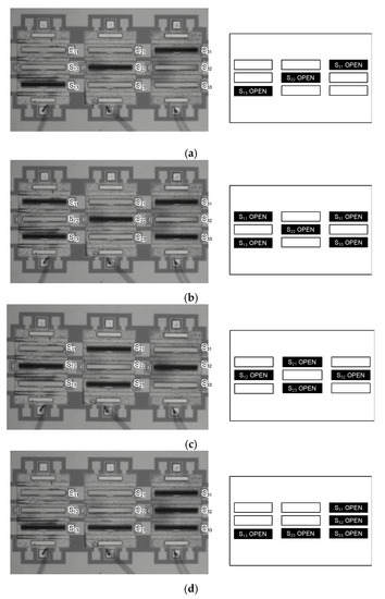 Figure 11 shows the results of sequential addressing test of the 3 × 3 shutter matrix. The shutter blade at the rest or close position reflects the illuminating light of the microscope, and therefore it looks bright in the photograph. The black slots are the shutters that have been electrically addressed. In Figure 11a, only one pixel out of every column was chosen, thereby to form a diagonal line at positions 13, 22, and 31. It was possible to choose more than two shutter elements in a single column or row to form cross-out and diamond shapes as respectively shown in Figure 11b,c. Addressing all the three elements in a column and a row was also possible as shown in Figure 11d. From these results, the developed control system and the sequential addressing approach were capable of addressing arbitrary ON/OFF patterns to meet the requirement for the reconfigurable slits array for multi-object spectroscopy.