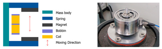 It is necessary to design a VEH device which has a smaller size and a practical power generation performance for applications on trains. To increase the generated power and miniaturize the VEH device, a new design was needed to increase the magnetic field size, which is a significant factor in power generation performance when applied to the train. The VEH device was designed so that the same magnets (neodymium, Nd) were arranged in double, and two coils were also arranged similarly to correspond to each upper and lower magnet, as shown in Figure 1 [5]. This structural design considered changing the magnet’s size while reducing the internal height, securing the maximum moving space (spring displacement) of the coil due to vibration. Each coil of a VEH device can be connected in series or parallel. The steel material was applied to the upper and lower parts by applying plating to the spring structure using the method widely used in the structural design of accelerometers and gyro sensors—electromagnetic induction. The VEH was designed to enable the changing of the resonant frequency by using the thickness of the spring and the intermediate-mass body, so that the power generation can be maximized at the resonant frequency. The magnets were the moving component of the VEH device and moved in the direction of motion.