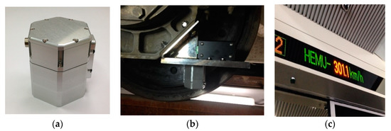 The VEH device with the protecting case (a), the VEH device for the high-speed train test on the axle box (b), the test speed example of the high-speed train during the VEH device test: 301.1 km/h (c).
