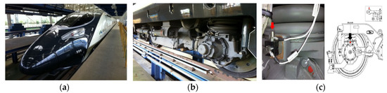 The sensor installation position on the axle of a high-speed train: (a) the high-speed train, (b) the bogie of the high-speed train, (c) the sensor at the axle box.