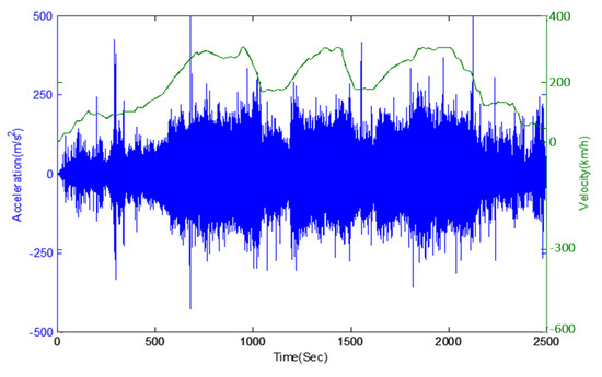 The vibration acceleration data on the axle box with velocity (km/h): (blue line) the vibration acceleration, (green line) the velocity data during the driving at 300 km/h. The maximum impact of the vibration acceleration occurred between about ± 30 (±300 m/s2) and about ± 50 G (±500 m/s2) during the period when the high-speed train traveled at 300 km/h.