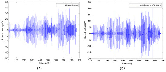 The generated voltage of the VEH device for the high-speed train for the lower coil before the spring damage on the high-speed train test about 900 s: (a) the induced voltage (V); open-circuit peak to peak voltage and (b) the induced voltage (V) with a 360 Ω load resistance—the peak to peak voltage.