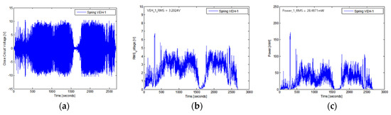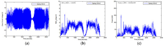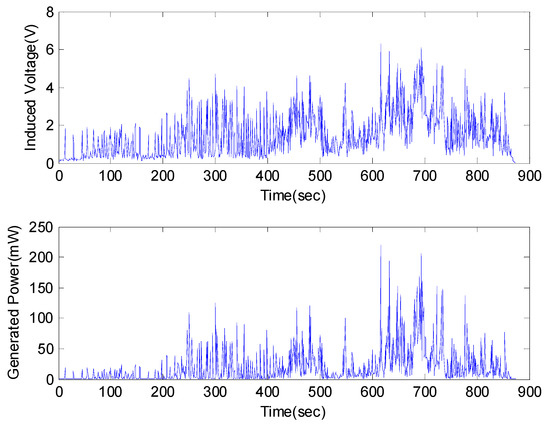 The results of the real-time generated voltage of the VEH device while the high-speed train was driving are shown in Figure 6 and Figure 7. The results were expressed in terms of a one lower coil basis in the VEH device for the standardization of the test results. Each coil of the VEH device can be connected in series or in parallel. The spring of the VEH device was affected by the high impact of the vibration acceleration, which was between ± 30 and ± 50 G. The spring was broken during the actual driving test before 900 s as shown in Figure 6. During this short time, the maximum values of the peak to peak voltage in both the open-circuit case and 360 Ω load resistance case were measured between ± 40 and ± 20 V at the VEH device. The RMS generated voltage, with a 360 Ω load resistance (Vrms-veh-T), was calculated as 1.87 V before the spring broke, as shown in Figure 7. In this case, a 360 Ω load resistance was similar to the 368 Ω internal resistance of one coil in the VEH device. Therefore, as the result of the Vrms-veh-T of the VEH device and Equation (3), the experimentally generated power with a 360 Ω load resistance (Pexp-veh-T) was calculated to be 9.71 mW for one coil of the VEH device. The total Pexp-veh-T of the VEH device connected in serial to the upper coil and the lower coil was 19.42 mW before the spring failed in the high-speed train test. These values of the RMS generated voltage (Vrms-veh-T) and generated power (Pexp-veh-T), before the spring failure, were significantly lower than the previous condition of the VEH device.
