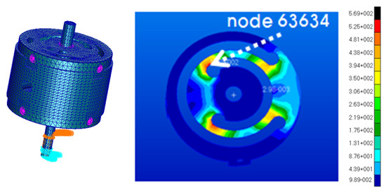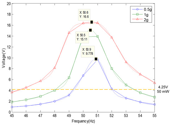 As shown in Figure 8, the finite element analysis (FEA) of the frequency responses for the VEH device was conducted before the laboratory test compared the maximum displacement and the maximum stress of the spring according to the vibration acceleration [45,46]. The finite element analysis (FEA) used solid (CTETRA) and shell (CTRIA3) elements with 49,064 elements, 14,507 nodes, and multi-point constraints MSC Patran/Nastran. The boundary conditions were applied to 0.5, 1.0, 2.0, and 3.0 for the vibration acceleration with MPC (multi-point constraints) at the solid and shell elements. The damping coefficient was set by the displacement measured in the performance test of the VEH device. The material properties of SKD 61 were 205.23 GPa (Young’s modulus); 0.29 (Poisson’s ratio); 9.19 × 103 kg/m3 (density); 1955 MPa (tensile strength). The thickness of the spring was 1.0 mm and the resonant frequency was 50 Hz. As a result of the finite element analysis (FEA) in Figure 9, it was confirmed that the maximum stress occurred at node No. 63634, and the vibration test confirmed the same position of the spring failure as shown in Figure 3. The displacement and stress values increased linearly with an increasing input vibration acceleration. The displacement of about 4.0 mm was observed at a 2.0 G vibration acceleration. At this time, it was confirmed that the maximum stress value was very high, at about 2000 MPa, and it was 3000 MPa at 3.0 G. With such results, the mechanical spring of the VEH device did not easily have durability when high vibration accelerations are input at such an impact load. The experiment in the laboratory also confirmed a similar result of the finite element analysis (FEA) [45,46]. The evaluation of the moving displacement of the spring and generation performance of the VEH device was conducted under controlled conditions in the laboratory as shown in Figure 10 and Figure 11. The same VEH device was installed on the vibrator to verify its performance. Only the material of the protecting case was changed from steel to aluminum in the VEH device. The system of the laboratory test was comprised as follows: a vibrator, a data recorder, an accelerometer, and a laser displacement meter for measuring the moving displacement. A data acquisition board (DAQ) was used for the analog data and the software for analyzing the measured voltage data was MATLAB. The VEH device was tested with the frequency increasing by 1 Hz in the 50 Hz ± 5 Hz frequency band under the same 0.5, 1.0, 2.0 and 3.0 G vibration acceleration conditions in the finite element analysis (FEA), as shown in Figure 12. The results were expressed in terms of one lower coil basis in the VEH device as mentioned above.