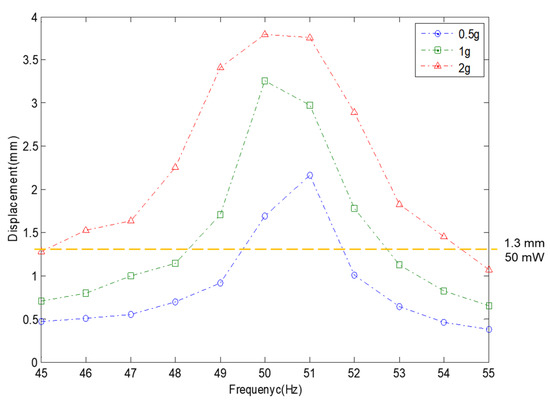 The test results of the moving displacement for the spring according to the vibration acceleration at one lower coil of the VEH device. The VEH device with a resonant frequency of 50 Hz was tested to increase the frequency by 1 Hz in the 50 Hz ± 5 Hz frequency band under 0.5, 1.0 and 2.0 G vibration acceleration conditions. The thickness of the spring was 1.0 mm. The maximum moving displacement of spring was 4.0 mm.