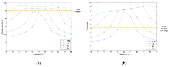 In addition, a study was conducted to find the effects of the moving displacement of springs and the stress changes according to the spring thickness under the limited moving displacement of spring. This experiment was performed by newly producing a 0.7 mm thickness of spring, lowering the resonant frequency of the VEH device to 45 Hz in a vibration acceleration range of 0.3 to 3.0 G, and comparing the results of the previous spring thickness of 1.0 mm and the resonant frequency that was set at 50 Hz. As shown in Figure 16, the moving displacement of the spring was limited to 2.0 mm above a 2.0 G vibration acceleration by applying the mechanical stopper similarly to the result of the 1.0 mm spring thickness. However, unlike the test results of the 1.0 mm spring in Figure 15a, the resonant frequency of a 0.7 mm spring thickness increased by 0.5 Hz from the original 45 Hz resonant frequency at a lower vibration acceleration input, 0.3 G, as shown in Figure 16b. It was reasoned that the vibration acceleration increased, the displacement of the spring increased more in a low thickness spring, and the spring’s stiffness increased, too. Therefore, the resonant frequency also increased more due to the use of a low thickness spring [47,48]. Thus, the resonance frequency was significantly changed by increasing the vibration acceleration, indicating a change of 3 Hz at a 1.0 G vibration acceleration and 5 Hz at a 1.5 G vibration acceleration at a more massive vibration acceleration.