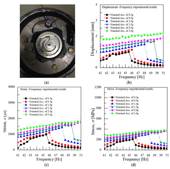 (a) The strain gauges on the spring of the VEH device at the stress–strain concentration place; (b) the change in both the displacement and the frequency according to the vibration acceleration; (c) the change in both the strain and the frequency; (d) the change in both the stress and the frequency. The thickness of the spring was 0.7 mm.