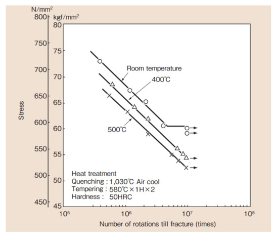 So, it is more important to secure the durability than change the stiffness and allow for a little change in the resonant frequency. The result of measuring the stress changed through the strain by attaching the strain gauge to the spring in Figure 16a; the maximum stress of a spring made of the SKD 61 material was confirmed to be about 400 MPa when the displacement was continuously limited to 2 mm, shown in Figure 16d, by the mechanical stopper at 2.0 G or higher. The results of the fatigue life in the S–N Curve—obtained through the rotational bending fatigue test of the SKD 61 base material, as shown in Figure 18 [49]—showed that the maximum stress of 400 MPa was lower than the fatigue limit of the SKD 61 material, and it was confirmed that durability of the VEH device using the mechanical stopper could be secured.