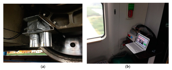 The VEH devices with the mechanical stopper for the high-speed train test: (a) the installation of two VEH devices on the axle box. Only the resonant frequencies were different from each other—one was 45 Hz, and the other was 50 Hz; (b) the voltage measurement system in the cabin.