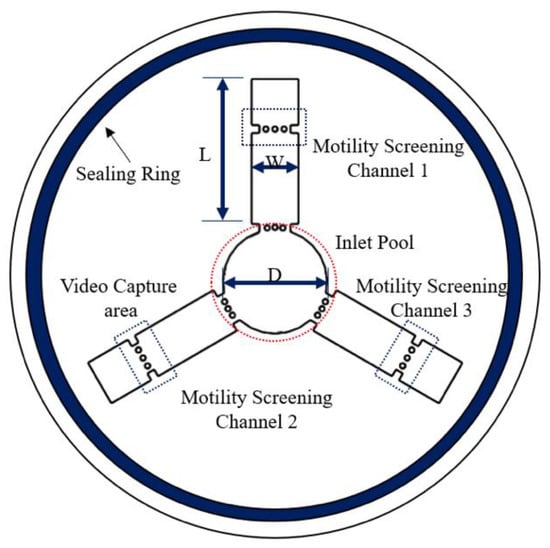 Schematic diagram of the device. Microfluidic device for human sperm evaluation and screening of swimming capability and swimming persistence; W and L represent the width and length of the channel, respectively. D represents the diameter of the inlet pool (the dimensions of the device are shown in Figure S1).