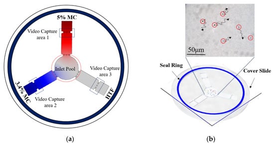 Each of the three straight pipes was filled with either 5% or 3.4% MC solution or HTF solution, and the semen sample was added to the central circular chamber. Figure 3a shows the final diffusion condition after three different media were pipetted into different channels. The various colors show MC solutions at different concentrations. Figure 3b shows the chip after adding the semen samples, and images were taken at each of the screening areas every 4 min to track sperm movement. After adding the semen sample, we put a cover slide on the PMMA device, then the sealing ring was quickly wetted and the chip was sealed with the cover. The chip system was placed in the inverted microscope (DMIRB, Leica, Wetzlar, Germany), and videos were recorded at each of the pipes. We independently replicated each experiment two times, with sperm samples from four donors.