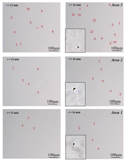 In this paper, we introduced a new assessment criterion: swimming capability. Compared with sperm motility, which refers to the movement and swimming of sperm, it puts more emphasis on the swimming ability of the sperm, in order to penetrate the viscous fluid. The images of sperm acquired at different time frames (12 min and 16 min) were presented in Figure 4. During the same period, there were fewer motile sperm in the zone filled with a 5% MC solution (named Area 1) than in the zone filled with a 3.4% MC solution (named Area 2). In addition, the greatest number of motile sperm was in the zone filled with HTF solution (named Area 3).