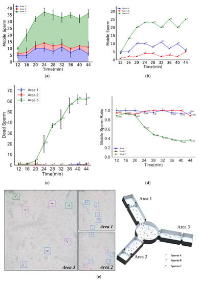 Figure 5a shows the number of motile sperm in each video capture area changed with time. As seen from the chart, Area 1 had the fewest number of motile sperm, followed by Area 2, and Area 3 had the greatest number of motile sperm in the images.