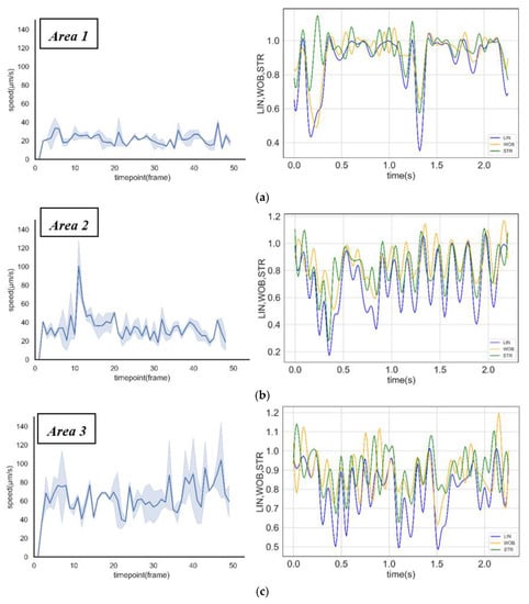 A research study by Eamer et al. [] suggests that human sperm swim slower and straighter as the viscosity of the swimming medium increases. In this study, the motility differences were caused by the change in viscosity. Based on the tracking of the specific grade of sperm, it was found that Sperm A could swim rapidly from the central circular chamber to Area 1. The count soon reached a dynamic equilibrium state; Sperm B swimming towards Area 2 took a longer time to attain a dynamic equilibrium state, and Sperm C took the longest time during the same process. The velocity distribution and motility parameters of sperm in different areas were shown in Figure 6a–c. When sperm swam into the high viscosity area (such as Area 1 and Area 2), their velocity decreased, and their motion behavior changed intensively (the motion parameters vs. time were shown in Figure 6a–c). This indicated that the sperm head began to wobble rapidly. These changes in motility and motion behaviors were the response mechanism of sperm in different viscosities.