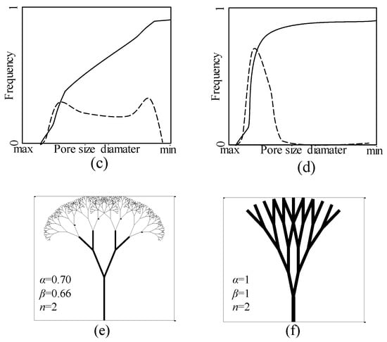 Tight matrix is special, particularly in pore structure. The pores in tight matrix are typically much smaller than normal formation; thus, tight matrix has a higher threshold pressure in the mercury injection curve. Moreover, it has more branch throats and micro-nano sub-pores. The schematic of mercury injection features and pore size distribution are expressed in Figure 1a,c (tight matrix), Figure 1b,d (normal matrix). As discussed, pore structures has fractal properties in a specific scale and can thus be described as a special fractal network. This model has the same pore size distribution as the target pore structure. It can also represent the differences on pore structure between tight and normal matrix, as shown in Figure 1e,f. The figures show that tight matrix has much more branches and smaller pores than normal one.