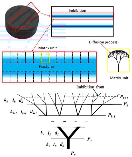 Considering the variety of pores, imbibition curves have different shapes. Imbibition curves are affected by complex structure of pores. It is a hard work to reconstruct real pore spaces for tight matrix. Luckily, pore structures have fractal properties in a specific scale [16,17,18]. A fractal tree-type network system model provides an effective way to simplify pore space of tight matrix. In fractal network system, the diameter and length of the tubes in each branch are determined according to fractal law, and their ratio between neighboring levels is deterministic, thus demonstrating the system’s self-similar (i.e., fractal) properties. Many studies have explored such a network system. Pence et al. computed the pressure and temperature distributions of this fractal-like branching network [19,20], and Xu studied the heat conduction and permeability of this network system [21,22].
