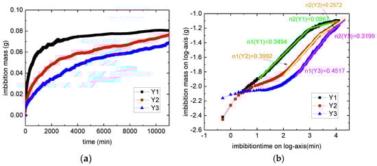 Imbibition curves for samples in regular and log-log coordinates. (a) is the regular coordinates, (b) is log-log coordinates. The slopes of linear part are marked in this figure.