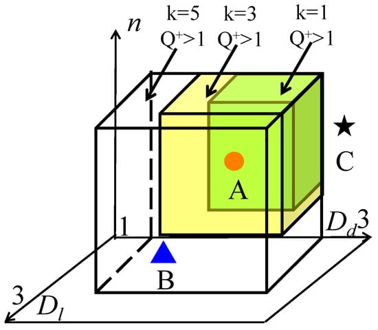 To clarify the most potential parameter combination for imbibition, we established an imbibition parameter cube based on Equation (8), shown in Figure 7. We mainly focused on the influence of four major factors , , , and on imbibition potential. So, these four structure parameters have taken into consideration: , , , and from analytic expression of dimensionless parameter in Equation (8). The X, Y, Z coordinate represents , , . The three parameters can just form a cube model. Any point in this space is presented as the imbibition potential calculated by the combination of the three parameters. Thus, in this cube model, we can easily see which parameter combination will gain the higher imbibition potential . can be regarded as a time-related parameter because as increases, the imbibition front imbibed in deeper network, and the imbibition time increase. This cube shows the location of the optimum combination of parameters (Figure 7). When k is stable, the parameter combination that leads to the largest in space is defined as the optimum combination of parameters, whereas the parameter combination that leads to in space is defined as a good combination of parameters. In Figure 7, zone A denotes that is always bigger than 1 regardless of the changes in k; zone B denotes that may become larger than 1 when k increases; and zone C denotes that will never be larger than 1 regardless of the changes in k. If a parameter combination of a sample falls in zone A, this sample’s pore structure has an excellent imbibition effect. If a parameter combination of one specific sample falls in zone B, this sample’s pore structure may have a potential imbibition effect in the future. If a parameter combination of one specific sample falls in zone C, this sample’s pore structure has a weak imbibition effect. In sum, when we obtain the structure parameter of a sample, we can directly find the imbibition characteristics of this sample from the structure. This technique is convenient. The structure parameter of a sample can be calculated by conducting the following steps. First, we obtain the pore size distribution from the mercury intrusion experiment or the digital core. Then, we can confirm the structure parameters in this model when the pore size distribution in the model matches that in the actual rock. Finally, the imbibition characteristic is shown in this cube.