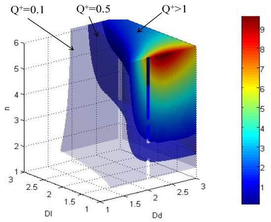 Based on this cube, we calculate the imbibition parameter cube of the model (Figure 8) based on Equation (8). This space contains every under the boundary conditions of , and when . The volume of suggests that this model has a good combination of parameters. This volume takes about 1/8–1/6 of the space. In other words, according to the structure parameter, only 20% of parameter combination is good for imbibition. The max is reached under the conditions of a smaller , a larger , and an appropriate .
