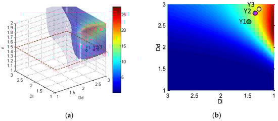 Based on the pore size distribution simulation, we have derived the fractal parameters for the three samples, shown in Table 3. Based on these parameter combination, we can easily draw the imbibition potential points in cube space, shown in Figure 9a,b is the 2D section with n = 1.5 for 3D cube, to show the position for Y1, Y2, and Y3 clearly (noticed that for Y3, n = 1.51, so the point is a projection on n = 1.5 surface). It is clear that all of the sample points fall in the zone A, indicating that these three samples have excellent imbibition potential. Among these three samples, as we calculated in Table 3, the dimensionless imbibition potential list from the strong to weak is Y3 > Y2 > Y1, indicating that Y3 sample has the highest diffusion potential, and Y1 has the lowest diffusion potential. This result matches well with the experiment result in Section 5 and Table 2. But in this model. In this way, we can see the model is a good model to evaluate the diffusion potential.