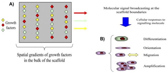 Schematics showing the role of growth factors (GFs) in tissue engineering (TE); (A) scaffold incorporated with GFs induces molecular signal and (B) molecular signal-induced cellular activities for the healing process of the defective tissue. This schematic is taken from reference [], copyright© 2008, Elsevier.