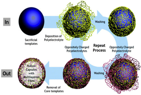 Schematic representation of polyelectrolyte multilayer capsules (PEMCs) formation using the polymer LbL deposition technique. This schematic is taken with permission from reference [], copyright© 2011, Royal Society of Chemistry.