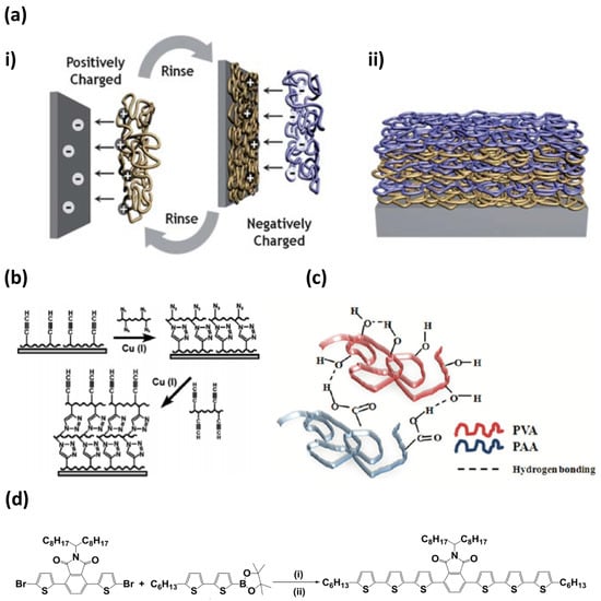 Schematics demonstrating the different forces that can occur during multilayer formation. (a) Electrostatic attraction, (b) covalent interactions, (c) hydrogen bonding, and (d) via charge-transfer interactions. (a) is taken with permission from reference [], copyright© 2011, Royal Society of Chemistry. (b) is taken with permission from reference [], copyright© 2006, American Chemical Society. (c) is taken with permission from reference [], copyright© 2012, American Chemical Society. (d) is taken with permission from reference [], copyright© 2017, Elsevier.