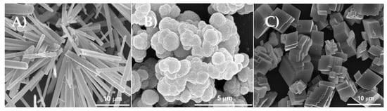 CaCO3 crystals are inorganic particles and exist as three main polymorphs, i.e., calcite, aragonite and vaterite. The calcite polymorph occurs naturally and is the most stable configuration [,,,]. The three polymorphs can be easily distinguished based upon their morphology. Aragonite crystals possess a needle-like shape, vaterite crystals are typically spherical crystals, and calcite is cubic-like in shape, as illustrated in Figure 4.