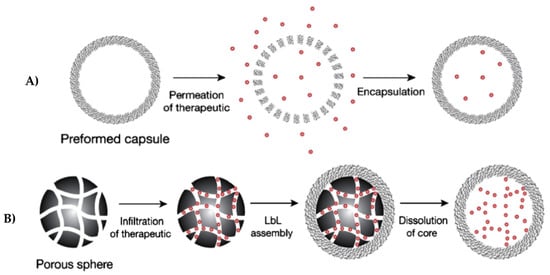 Schematics for the encapsulation of molecules of interest (e.g., bioactives) into hollow PEMCs: (A) loading into pre-formed PEMC and (B) incorporation into a porous sacrificial core utilized to assemble the PEMC. This figure is taken with permission from reference [], copyright© 2006, Elsevier.